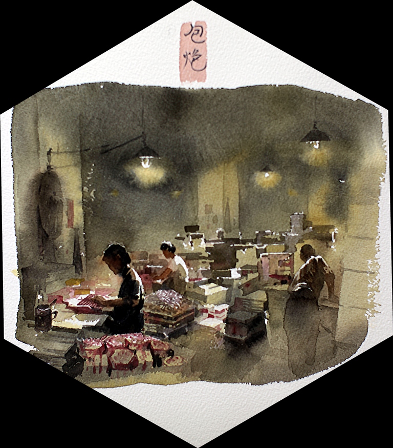 这一系列作品还融入了廖文畅大师独特的水彩画风格,直观地叙述鞭炮行业的传统生 产过程及其周边的人物事。事实上, 这个行业是澳门悠久历史的无价见证,亦象征着本土扎根行业所在。